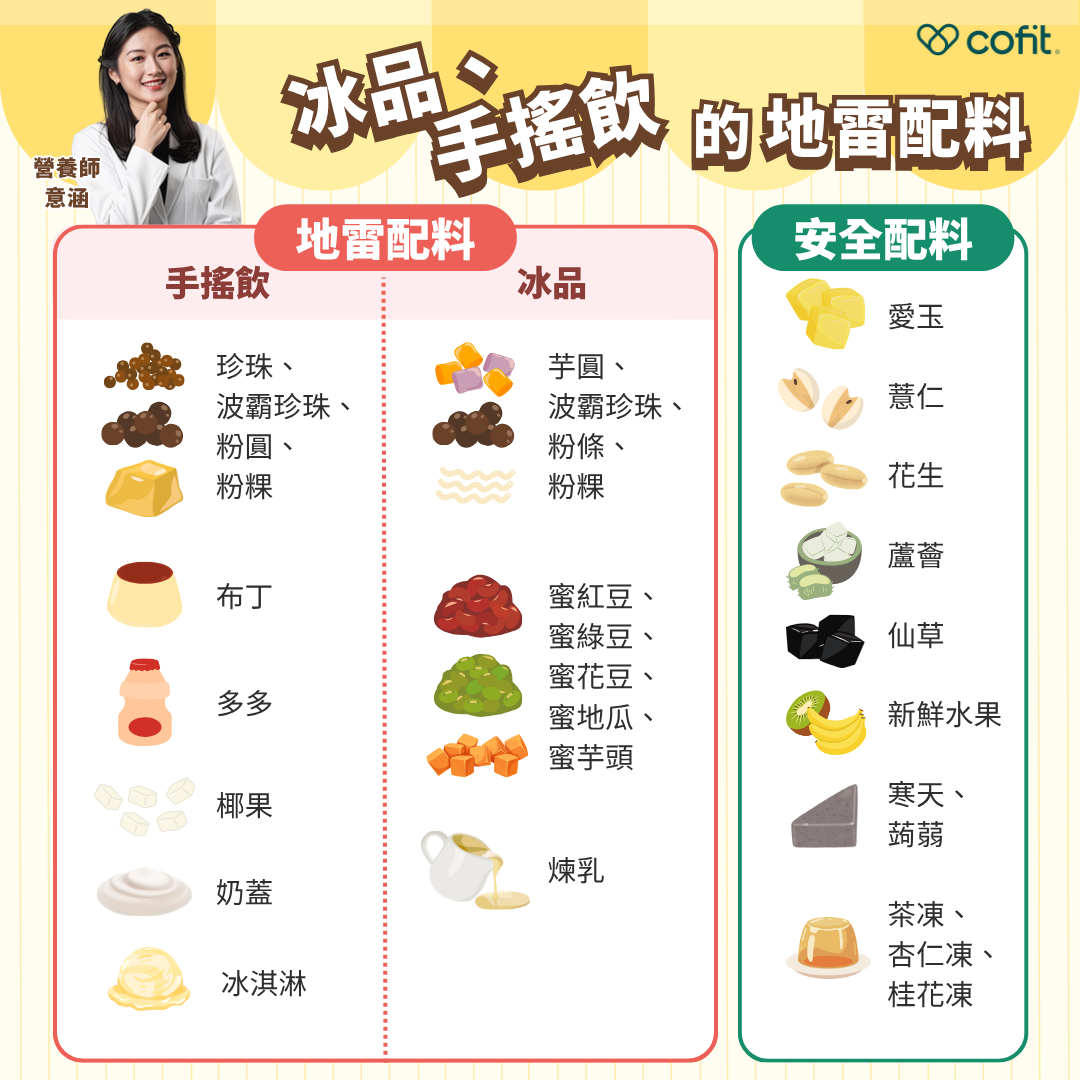- 小心高糖配料:布丁、椰果、蜜紅豆、蜜芋頭…盡量少碰。