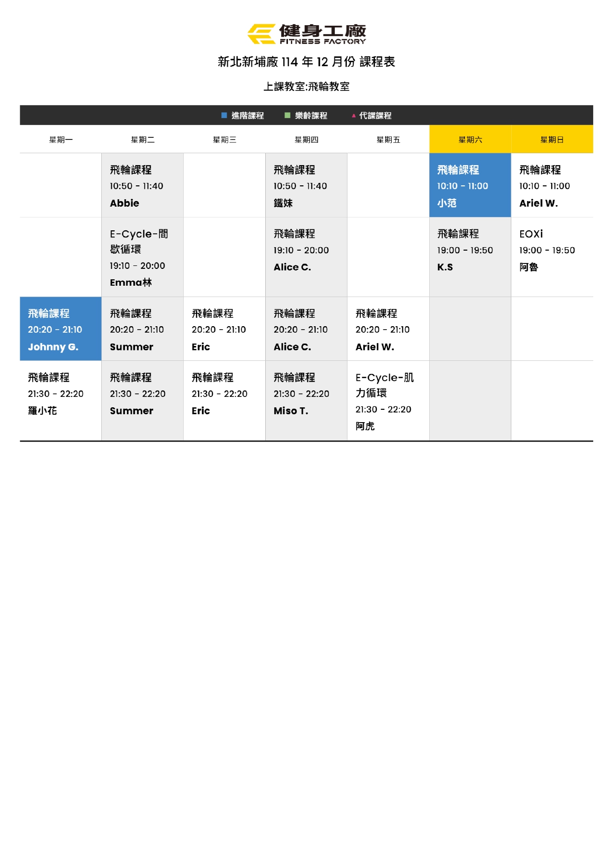 24Nov.2025【課表】新埔廠-12月飛輪課表