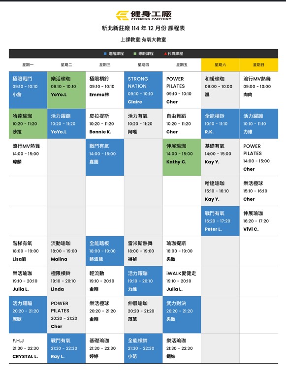 25Nov.2025【課表】新莊廠-12月 有氧課表
