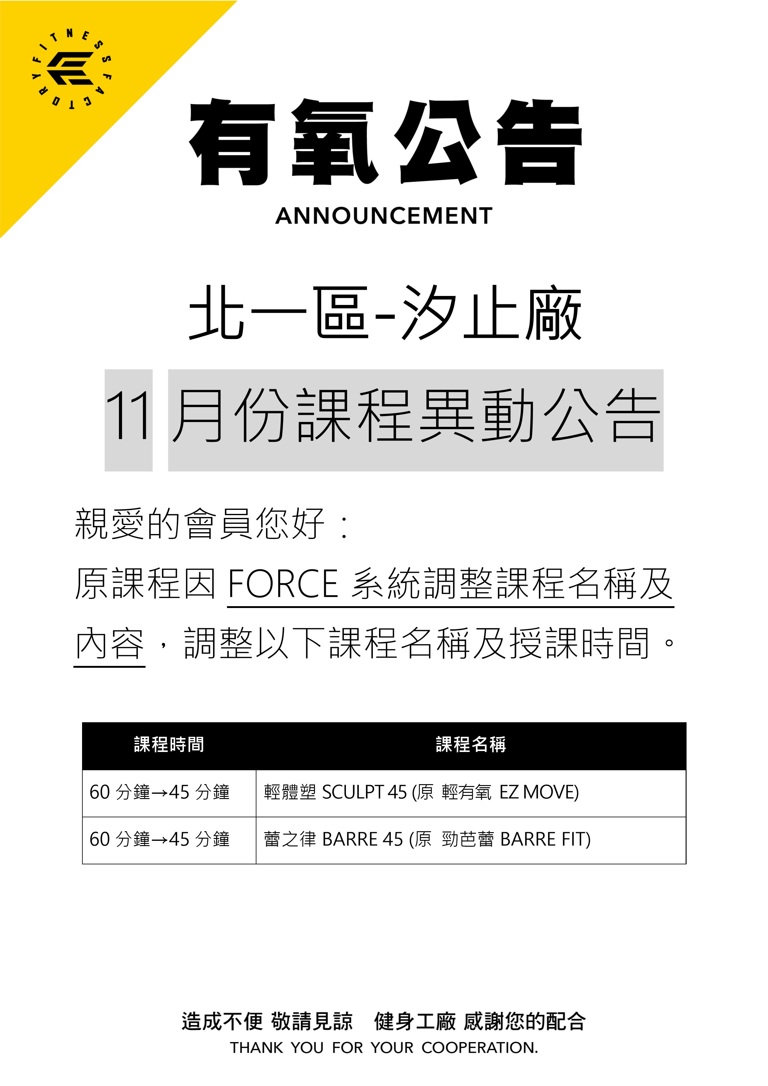 23Nov.2025【有氧公告】汐止廠 課程異動公告