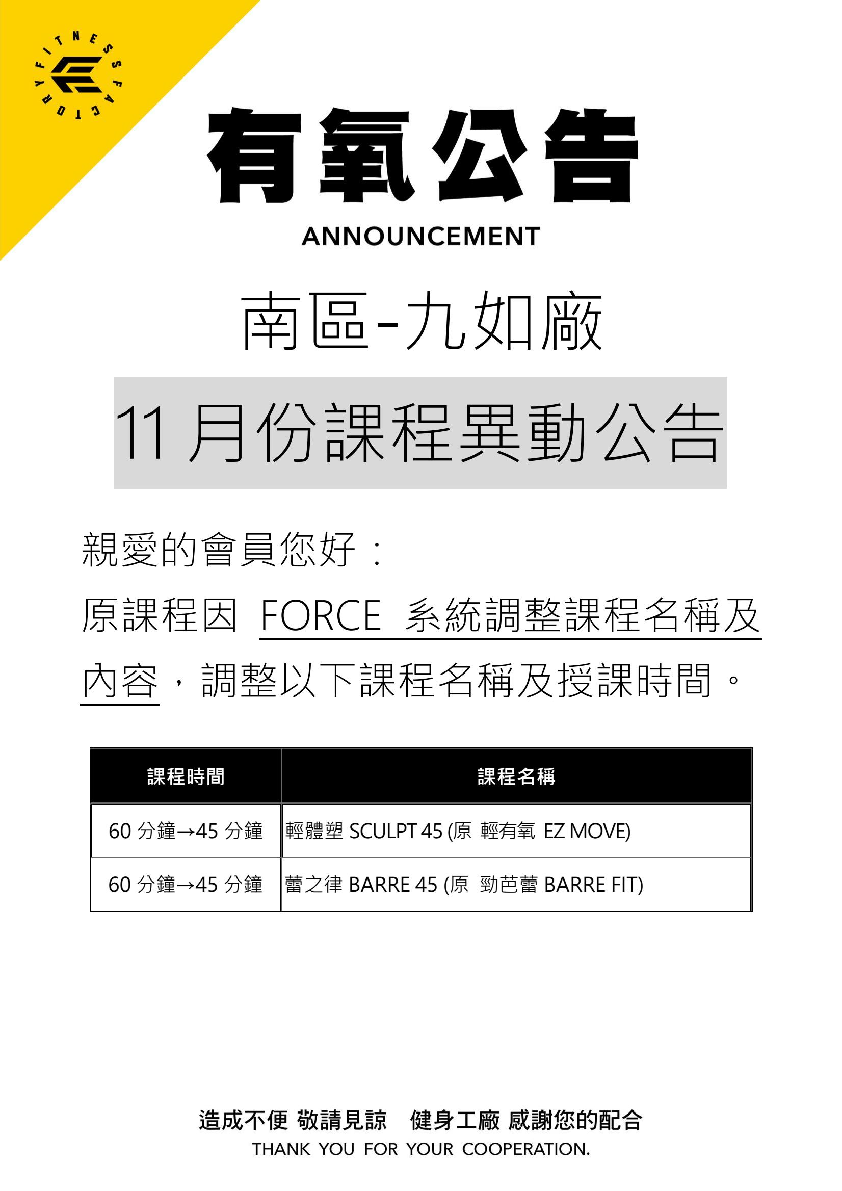22Nov.2025【有氧公告】 九如廠 課程異動公告