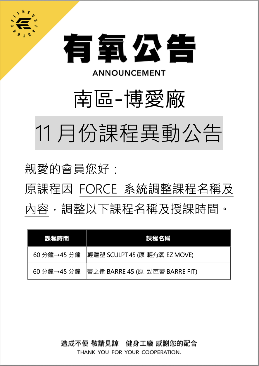 22Nov.2025【有氧公告】 博愛廠 課程異動公告
