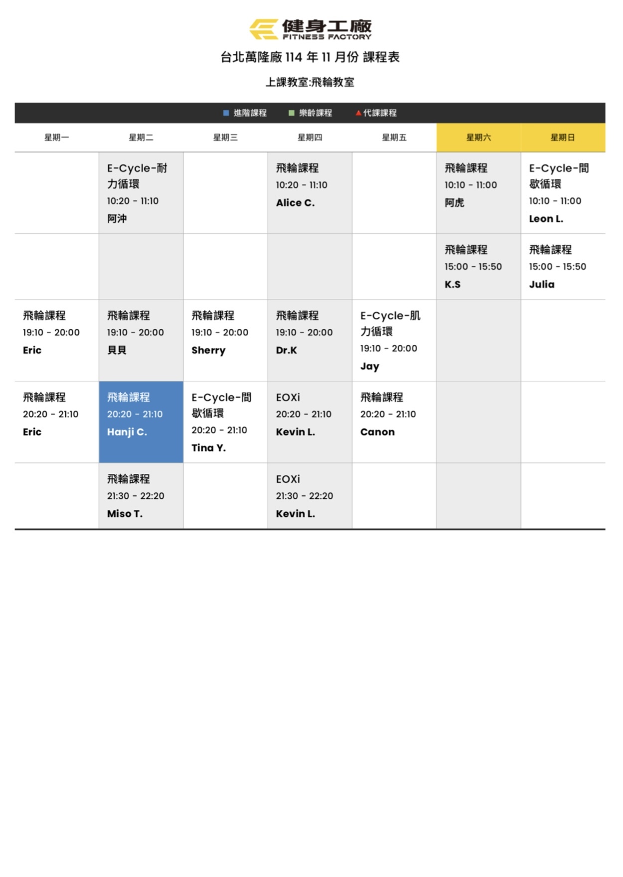 24Oct.2025【課表】萬隆廠-11月飛輪課表
