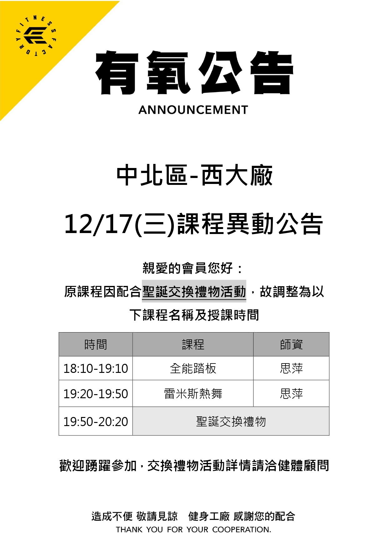 07Dec.2025【有氧公告】西大廠 12月課程異動公告