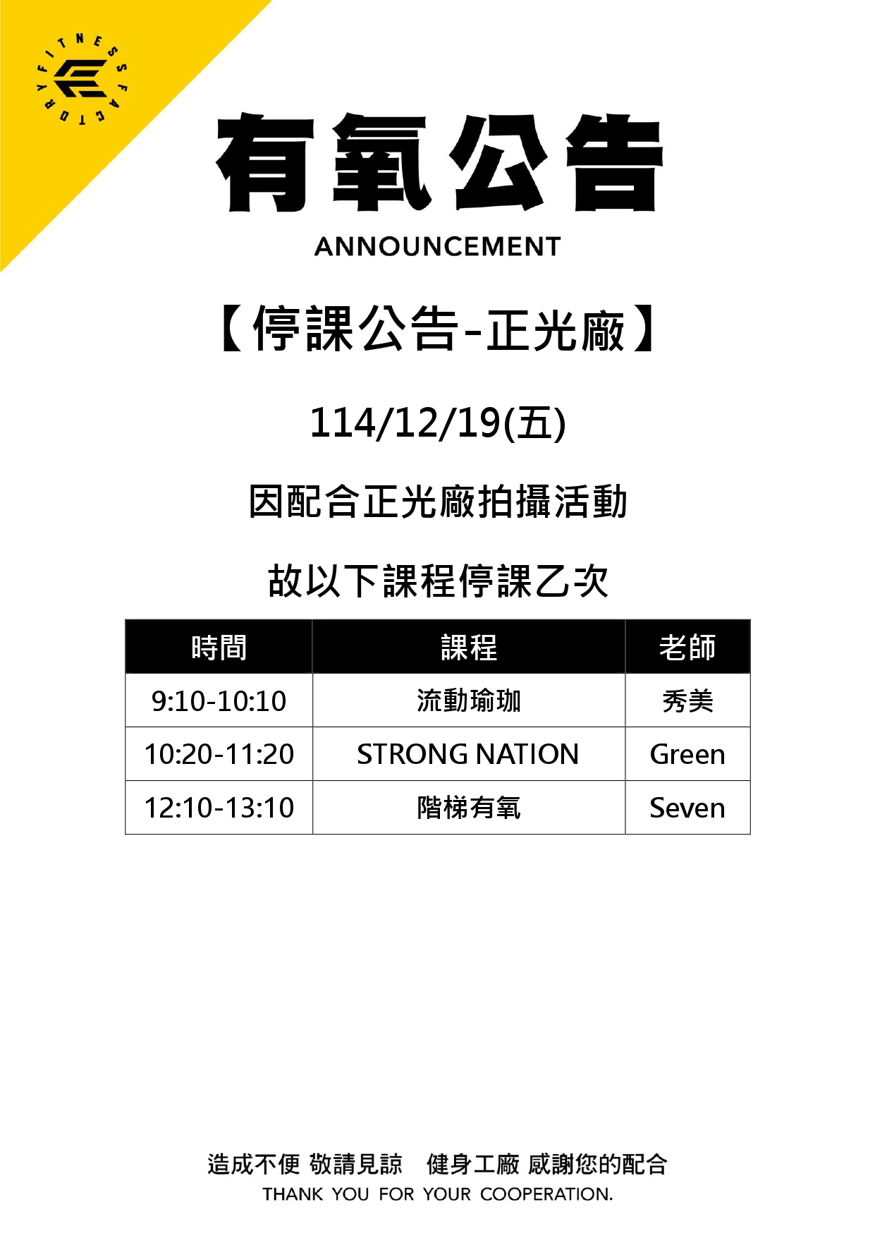 10Dec.2025【有氧公告】正光廠 12月課程停課公告