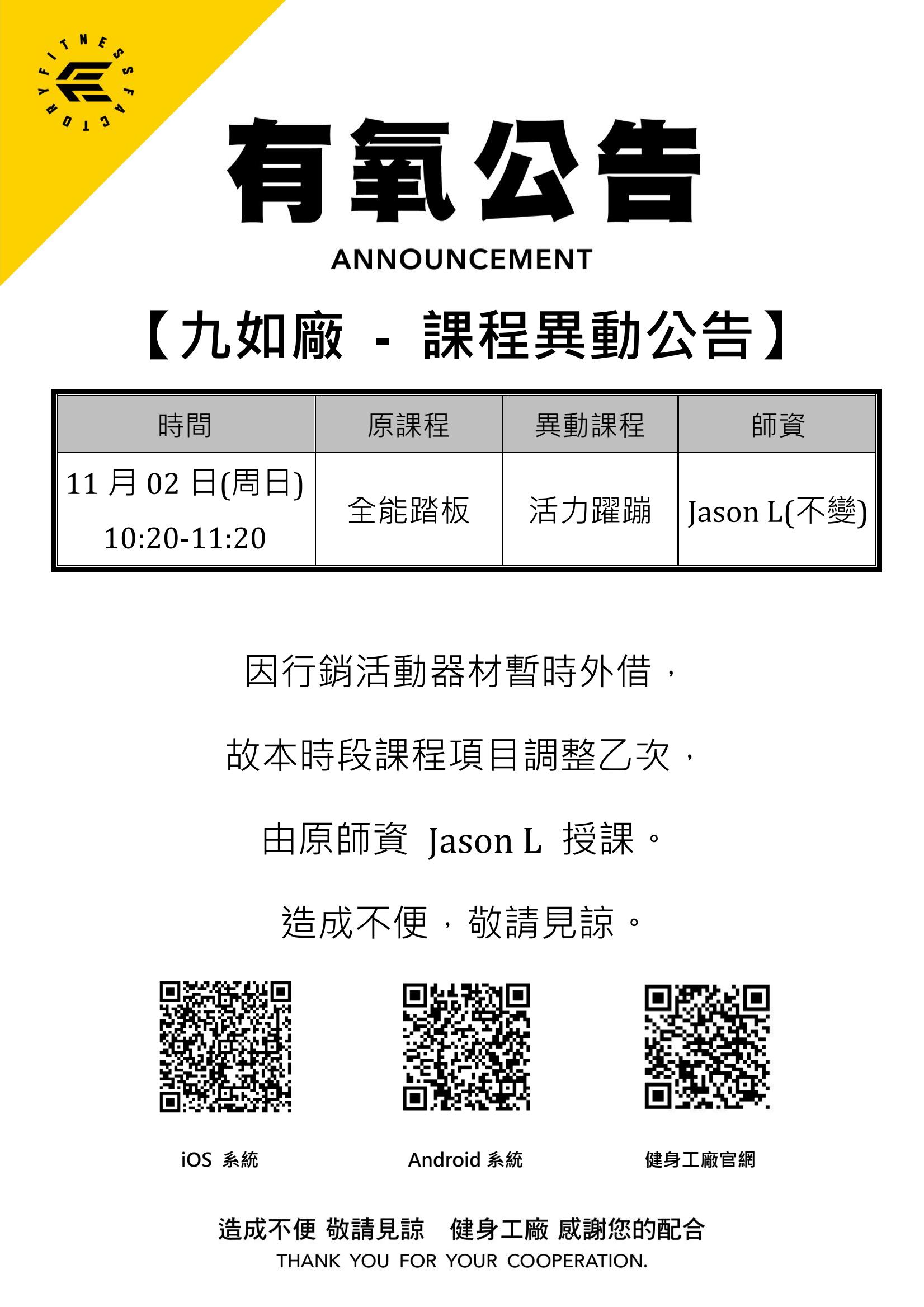 02Nov.2025【有氧公告】九如廠-11月02日課程異動