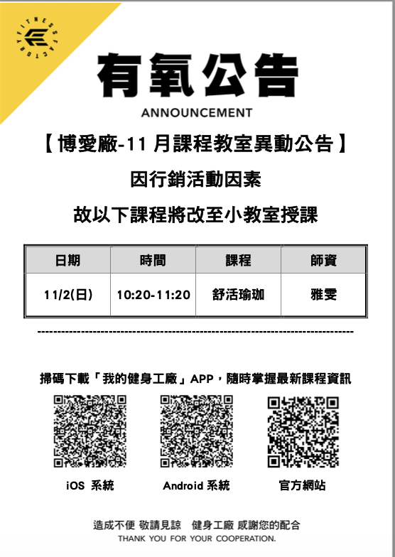 02Nov.2025【有氧公告】博愛廠-11月課程教室異動