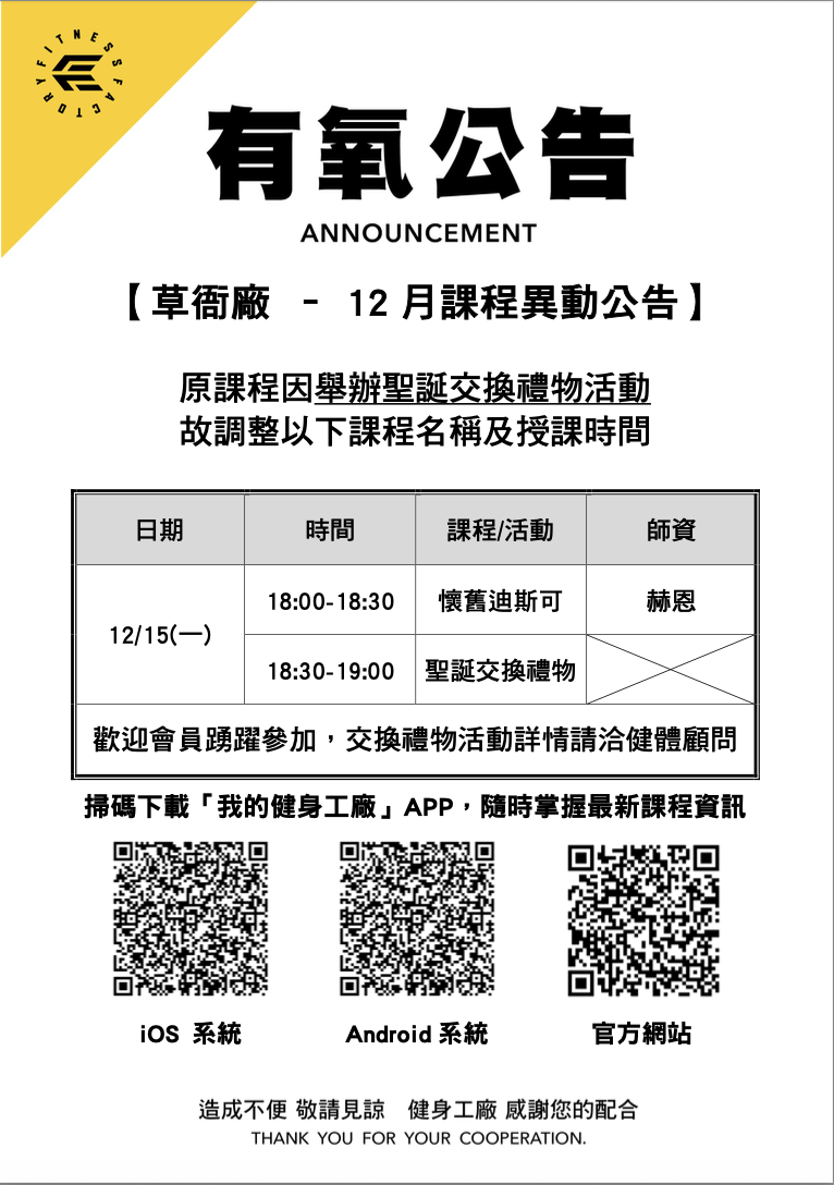 以下為最新公告,包含課程異動調整、營業時間異動與輔具公告等等