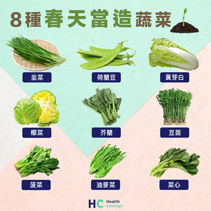 春天也是飲食最有變化的季節之一。台灣春天的季節蔬菜非常豐富,像是菠菜、油菜、小白菜、莧菜和地瓜葉等葉菜類最嫩甜;十字花科的高麗菜、花椰菜、芥藍菜口感清脆、苦味低;果菜類則有番茄、小黃瓜、茄子可以涼拌或快炒;根莖類則以春筍最具代表性,鮮甜脆嫩,是春季餐桌的重點食材。