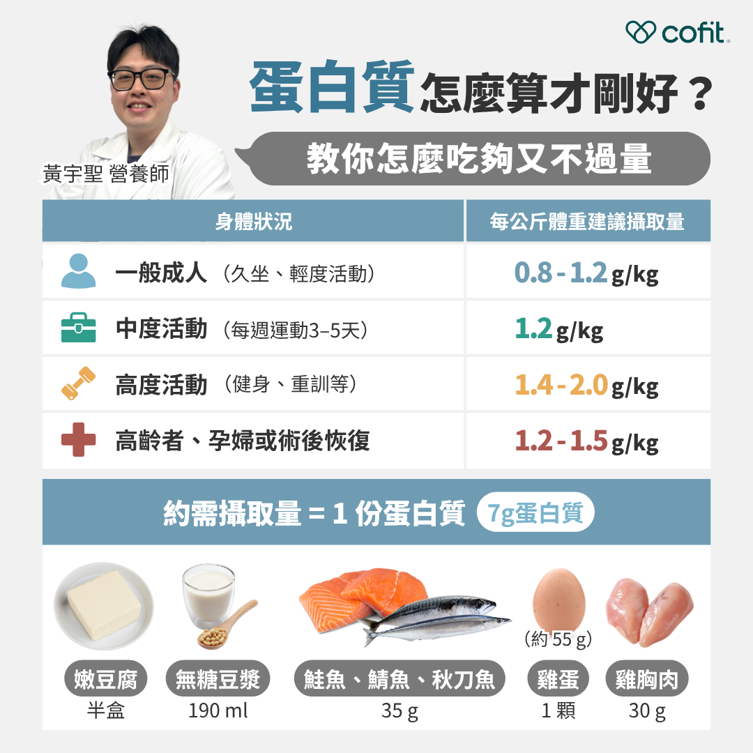每個人需要的蛋白質量,其實不完全一樣,會依照你的體重、活動量、年齡與身體狀況而有所不同。