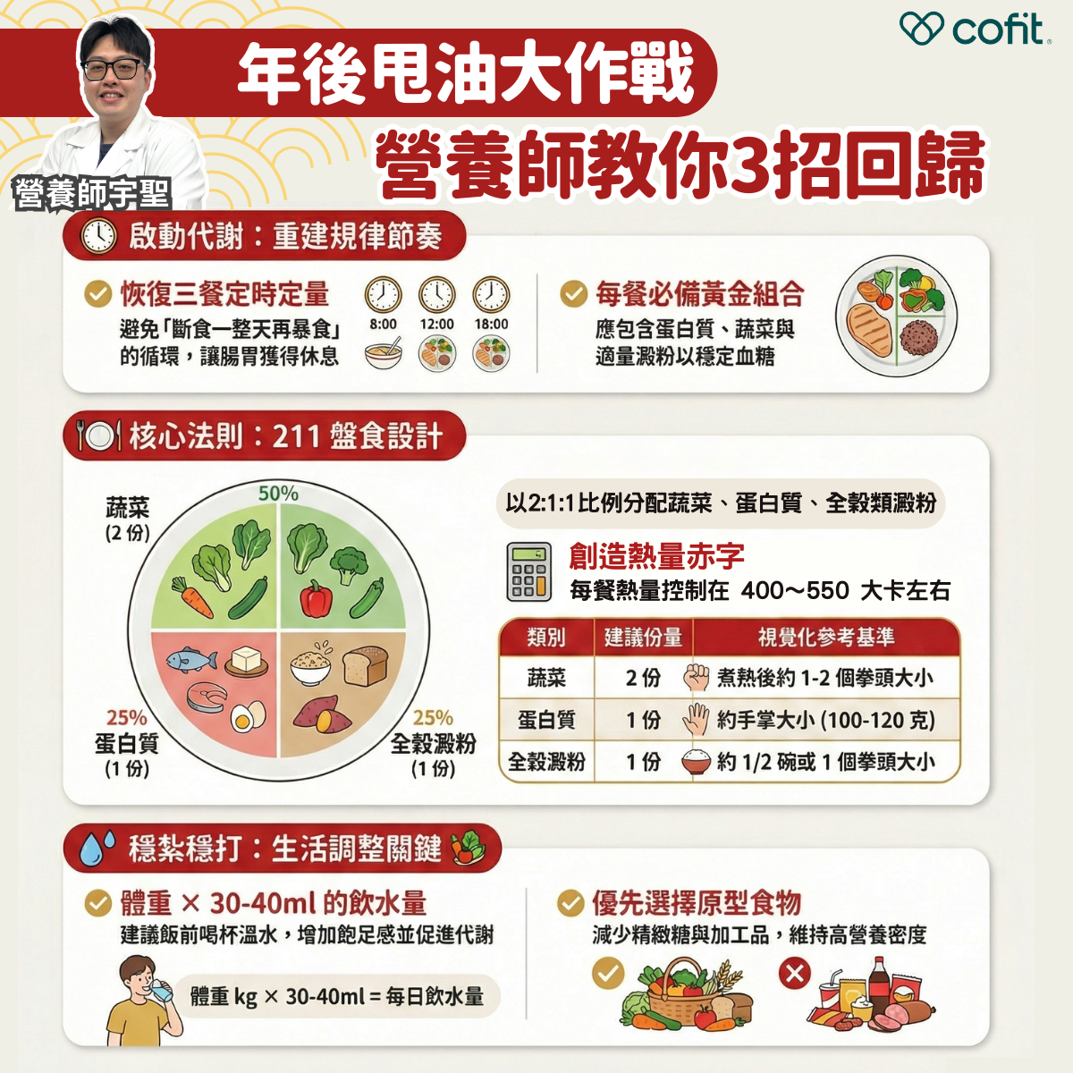 其實,過年偶爾放縱一下並不是什麼大錯,與家人團聚、共享好料是華人文化中最溫暖的時刻。但年後若想回到輕盈狀態,就需要一點策略性調整。營養師提醒:與其極端節食,不如採取更聰明的調整方式,讓身體慢慢「歸位」,才是長久有效的做法!