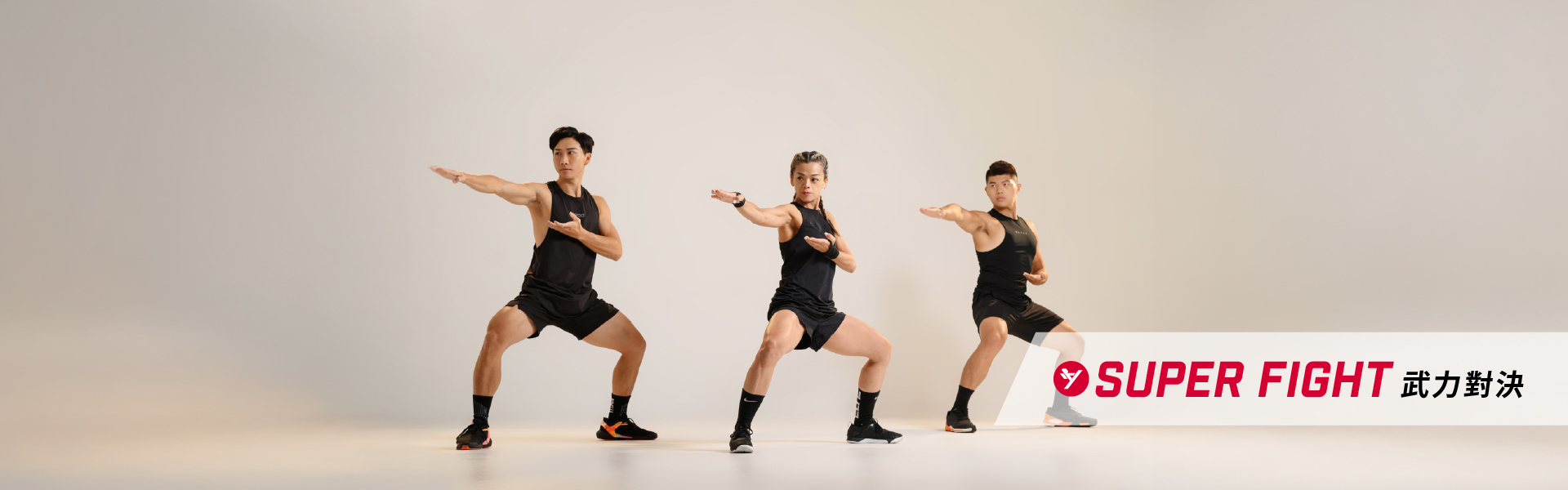 🔺Super Fight 武力對決融合古泰拳、空手道、跆拳道、拳擊及武術元素,以生理學為基礎,進行3階段心肺高峰的間歇訓練,提升運動強度及心拍數。