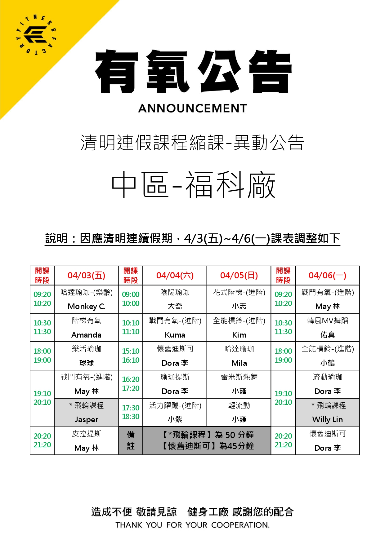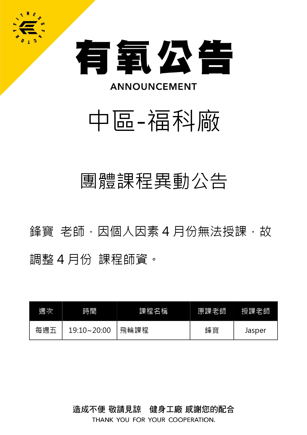 30Mar.2026【有氧公告】福科廠 4月份課程異動公告