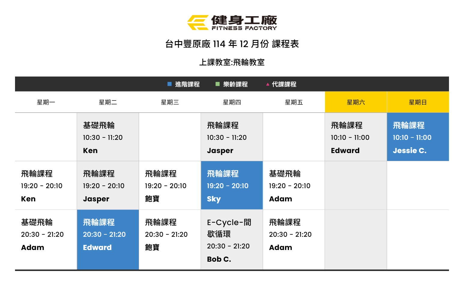24Nov.2025【課表】豐原廠-12月飛輪課表