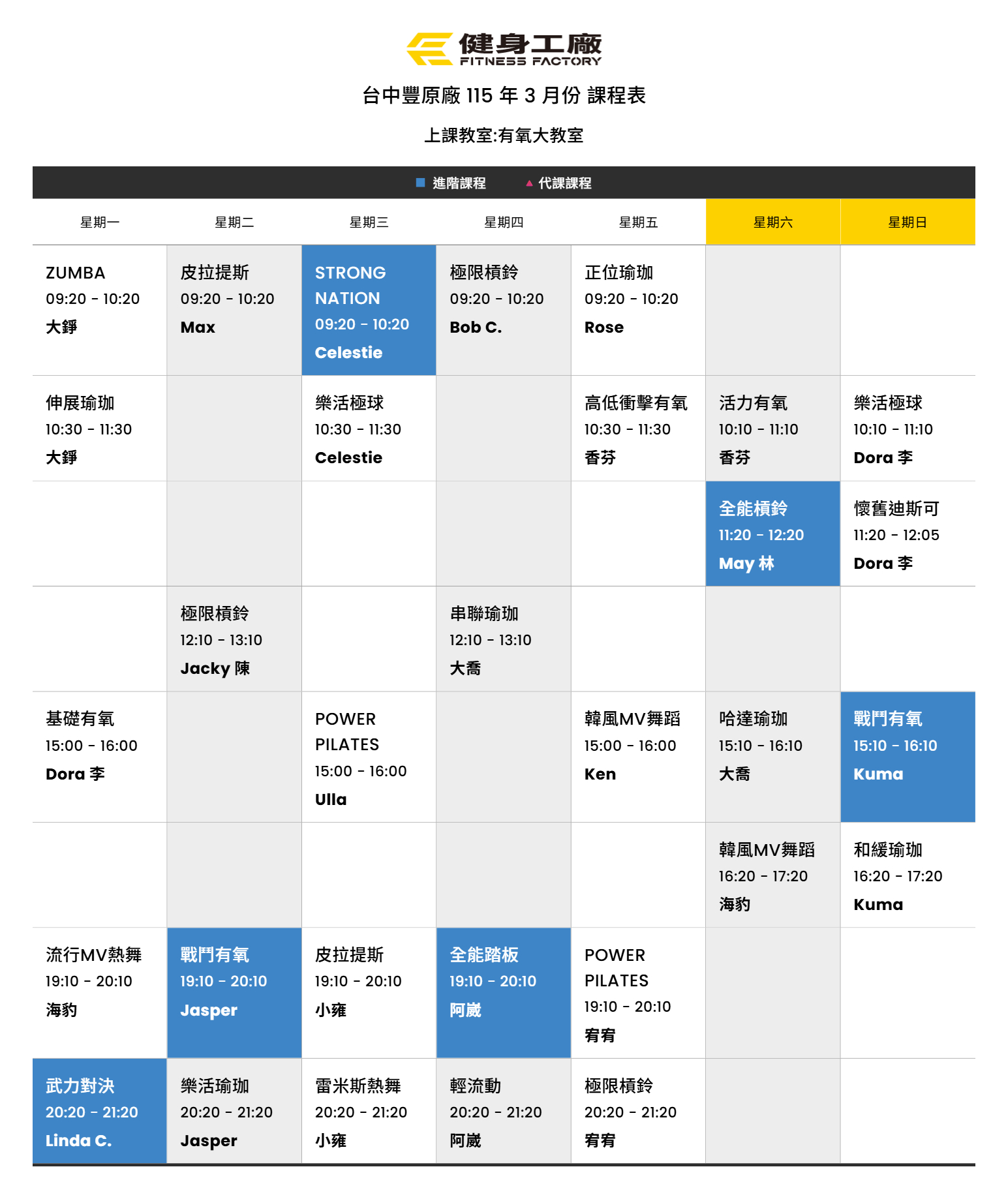 25Feb.2026【課表】豐原廠-3月有氧課表