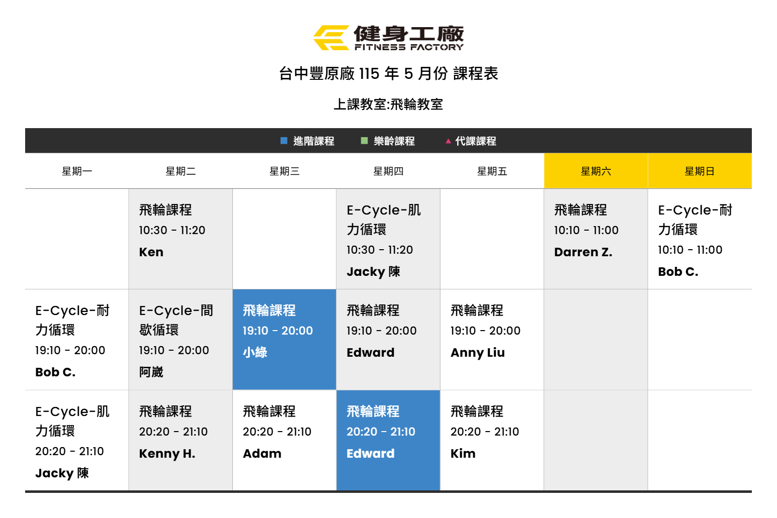 26Apr.2026【課表】豐原廠-5月飛輪課表
