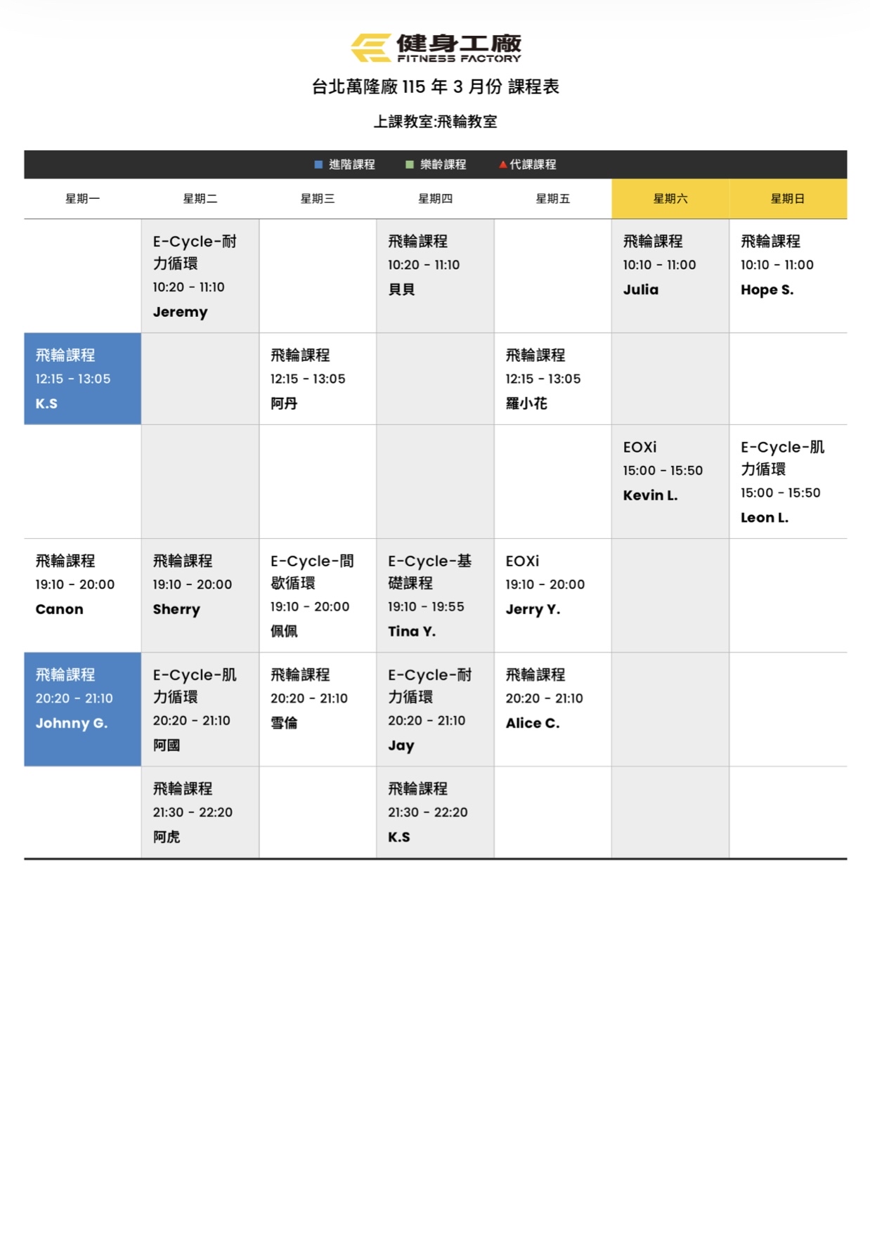 25Feb.2026【課表】萬隆廠-3月飛輪課表