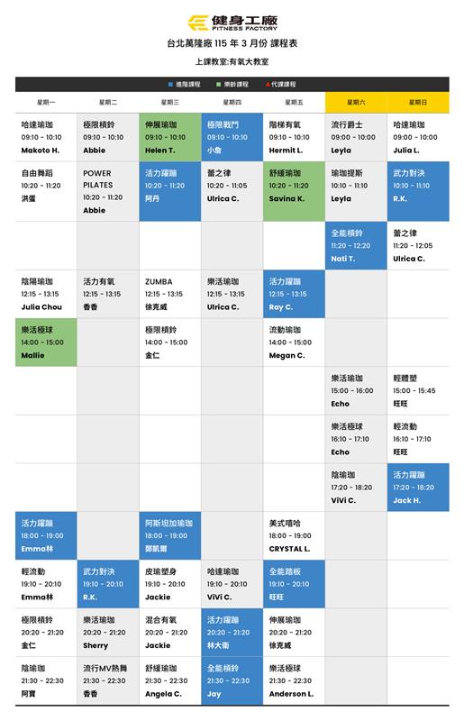 25Feb.2026【課表】萬隆廠-3月有氧課表