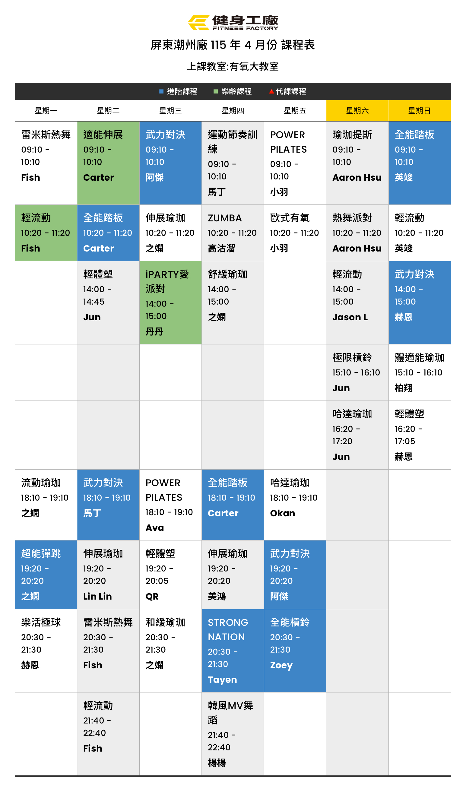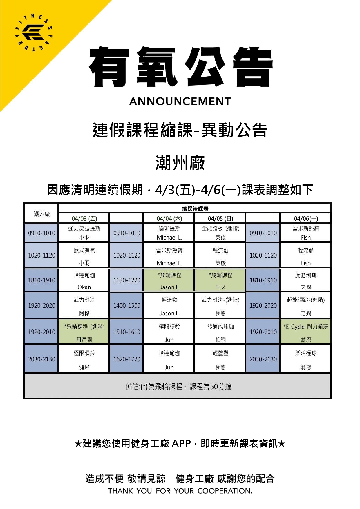24Mar.2026【課表】潮州廠-4月有氧課表