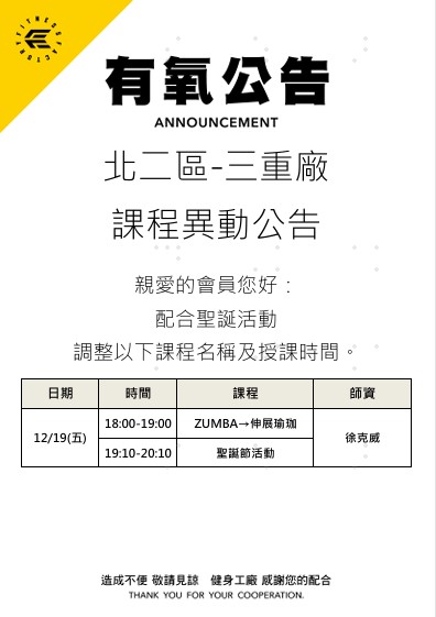 18Dec.2025【有氧公告】三重廠 12月課程異動公告