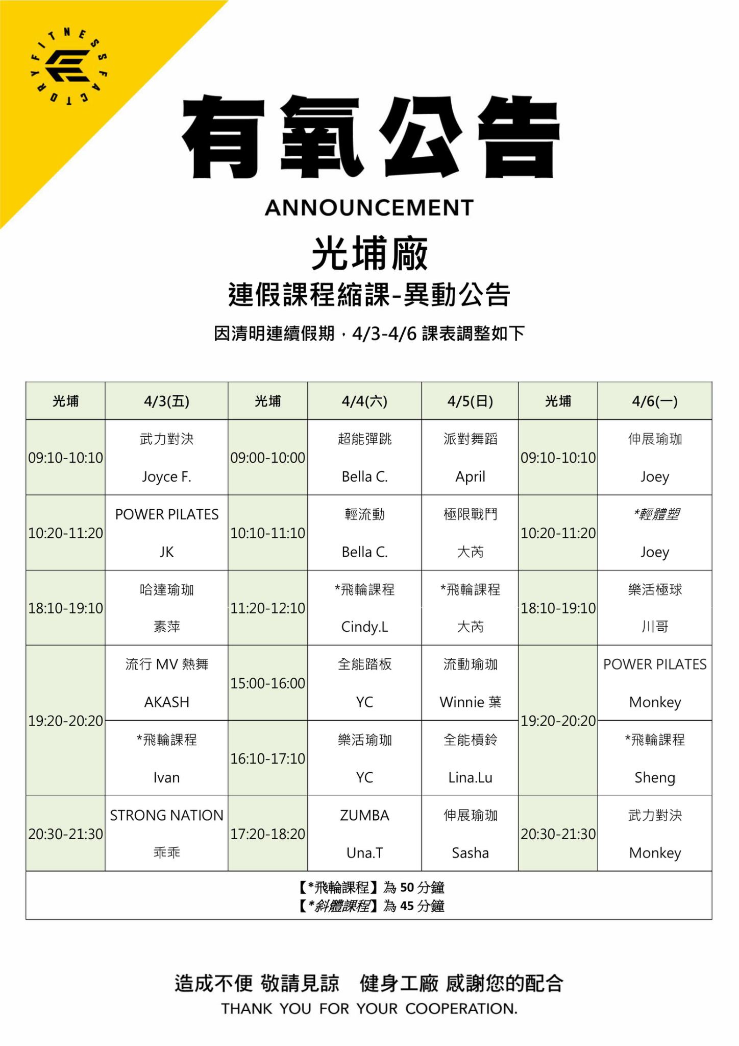 24Mar.2026【有氧公告】光埔廠 清明連假縮課公告