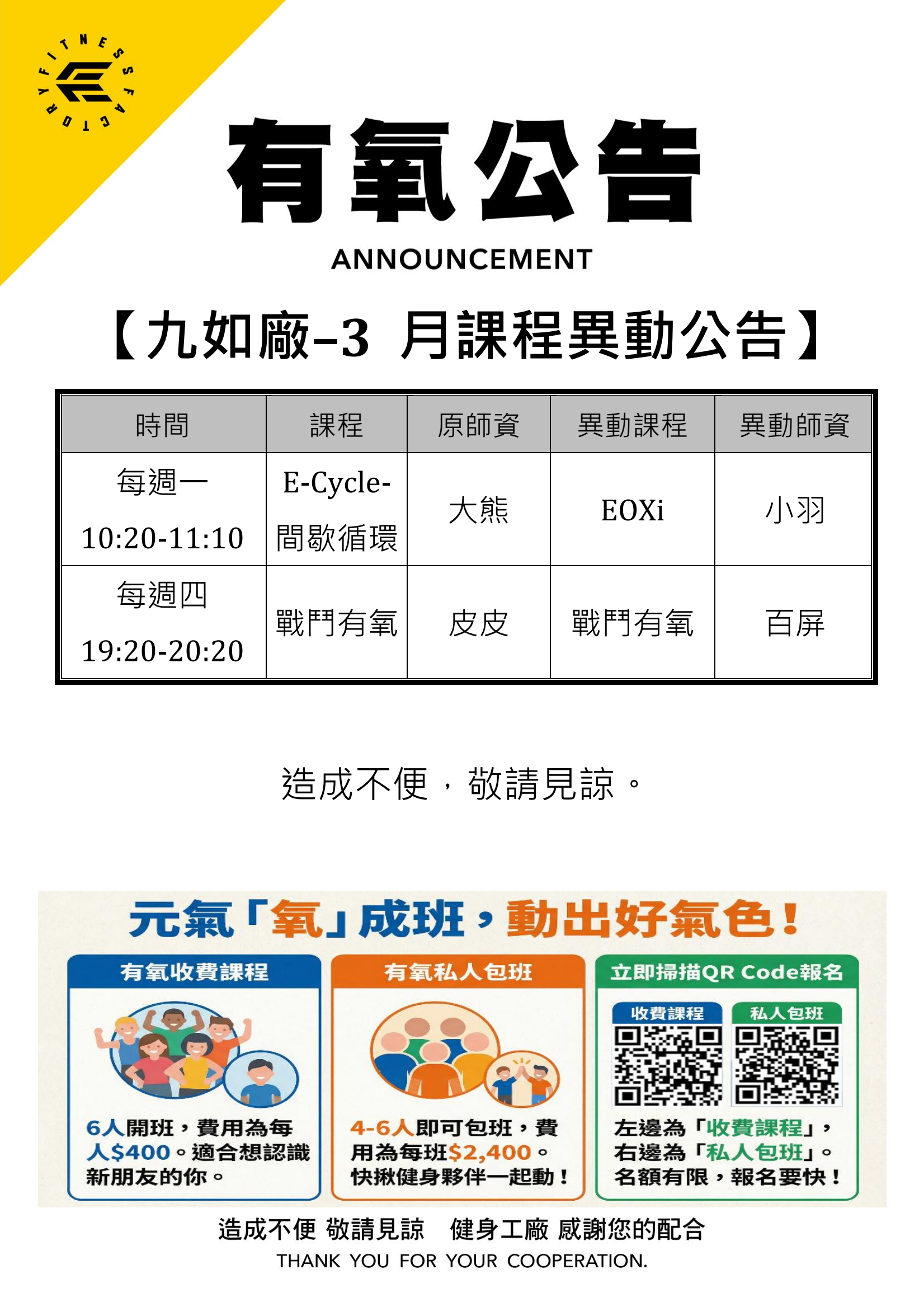 06Mar.2026【有氧公告】九如廠 3月課程異動公告