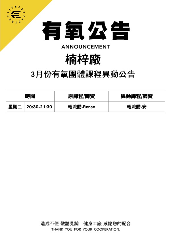 01Mar.2026【有氧公告】楠梓廠 3月課程異動公告
