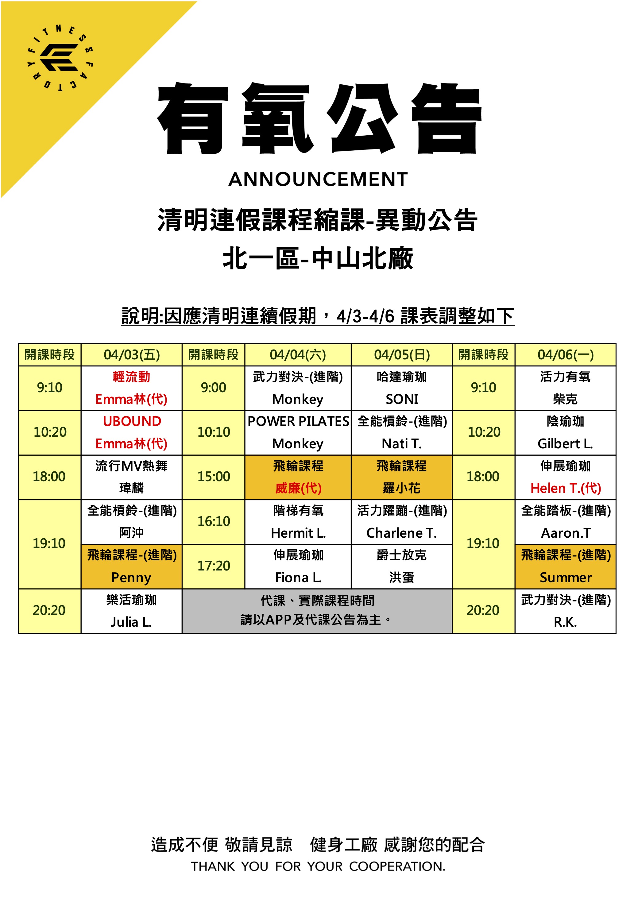 25Mar.2026【有氧公告】中山北廠 清明連假縮課公告