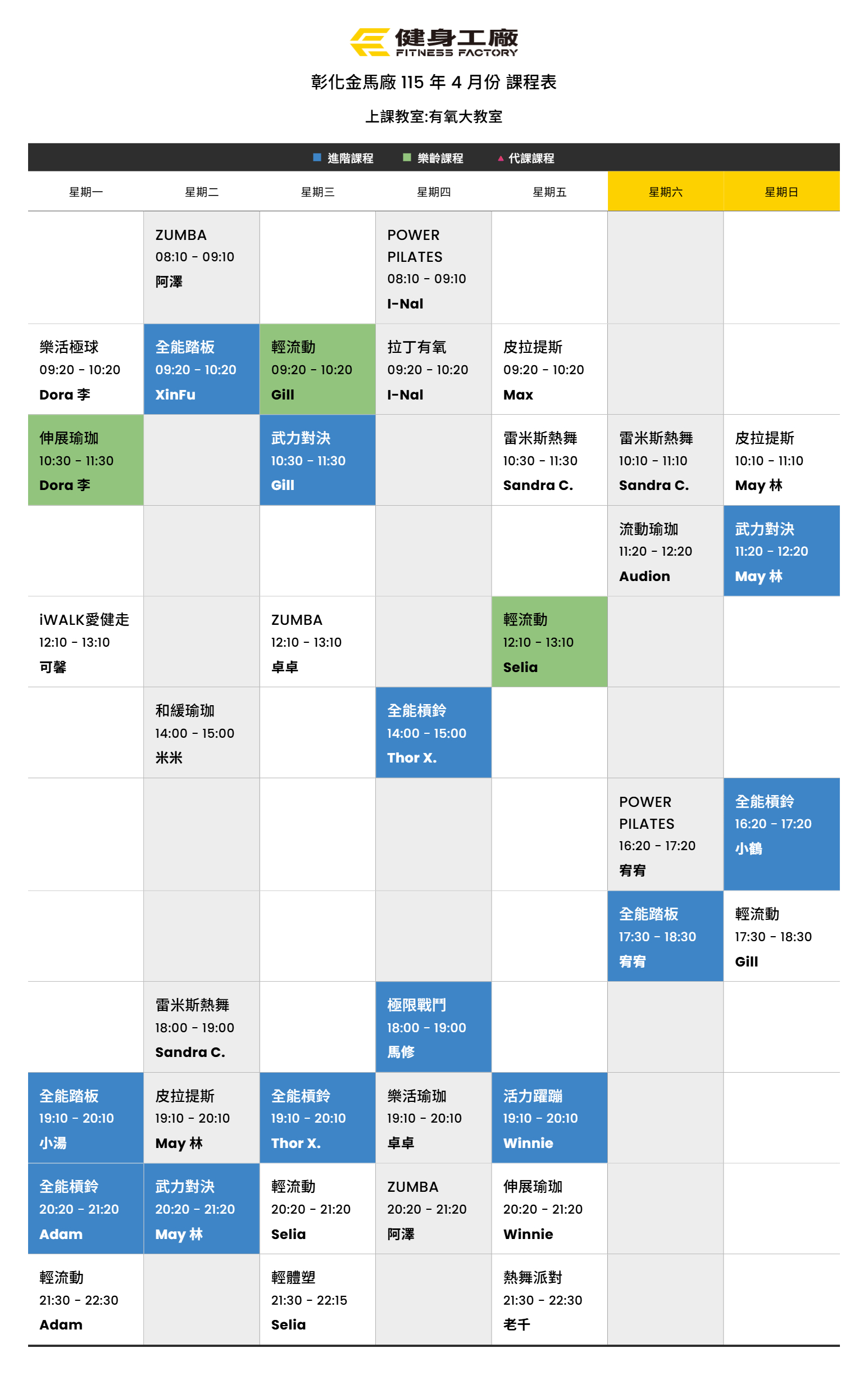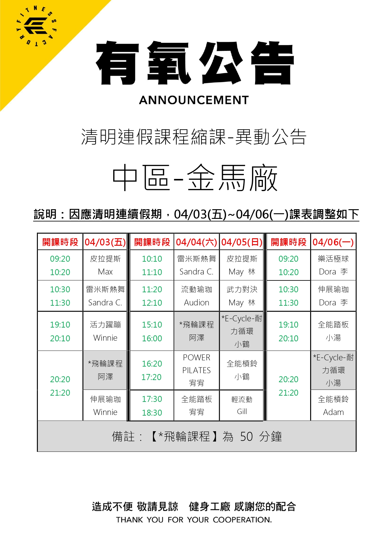 24Mar.2026【課表】金馬廠-4月有氧課表