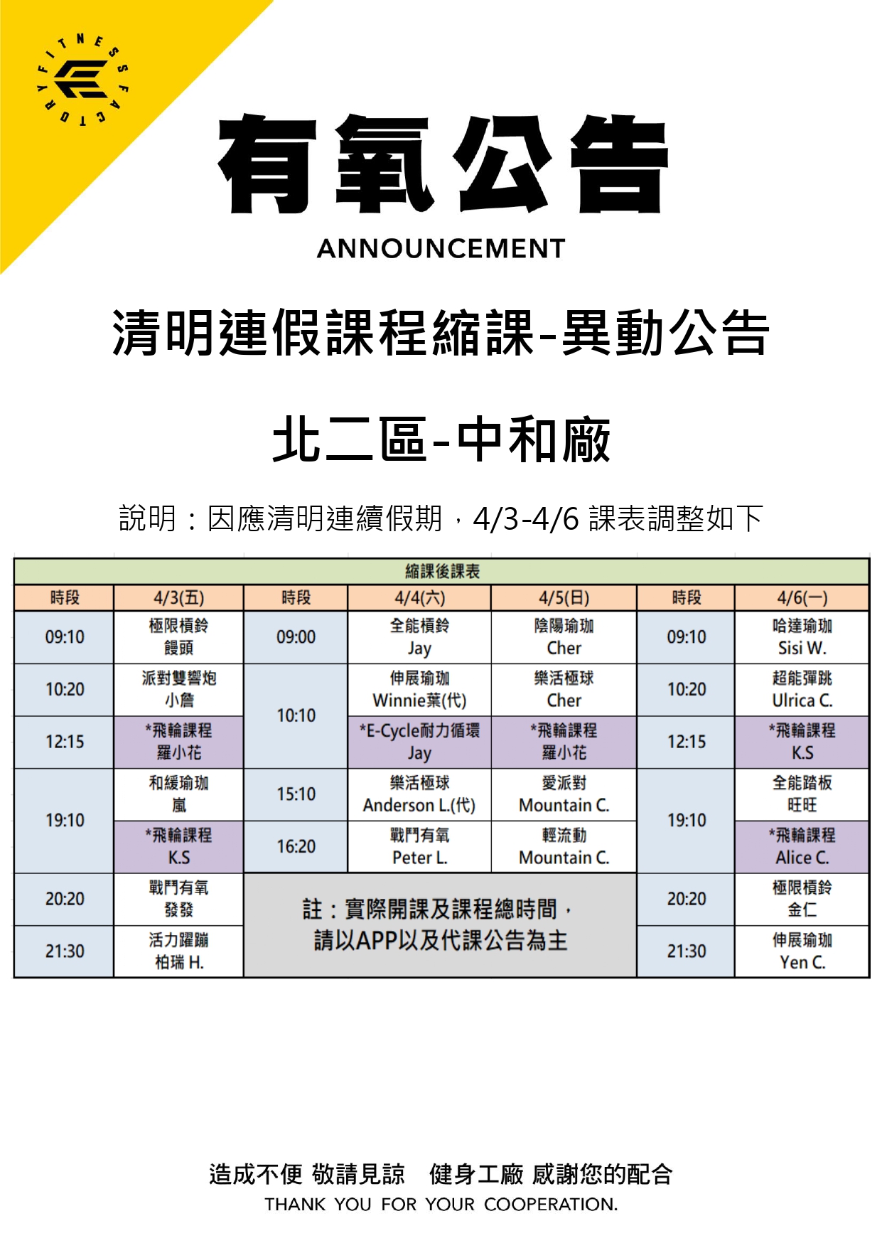 24Mar.2026【有氧公告】中和廠 清明連假縮課公告
