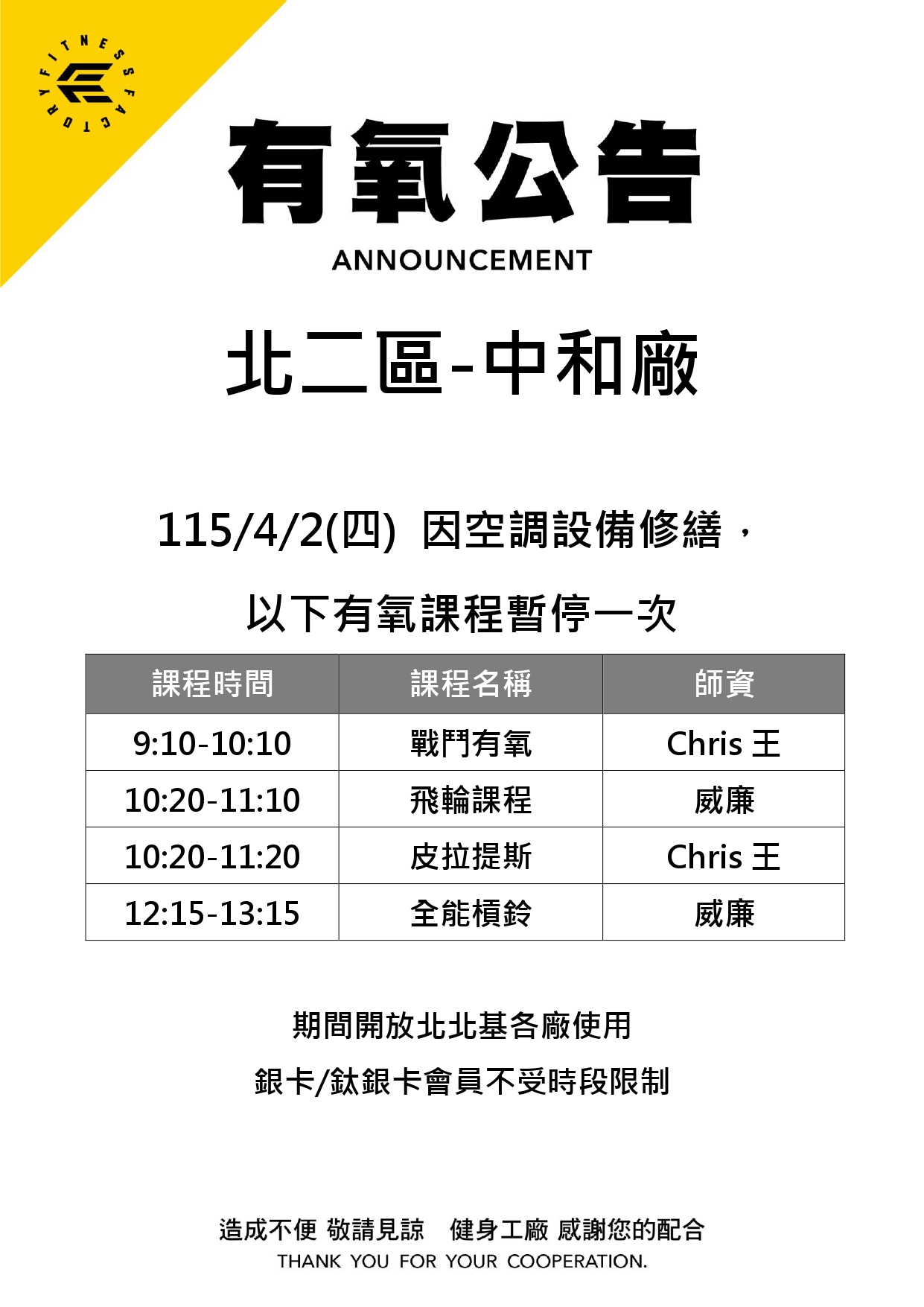 31Mar.2026【有氧公告】中和廠 4/2停課公告