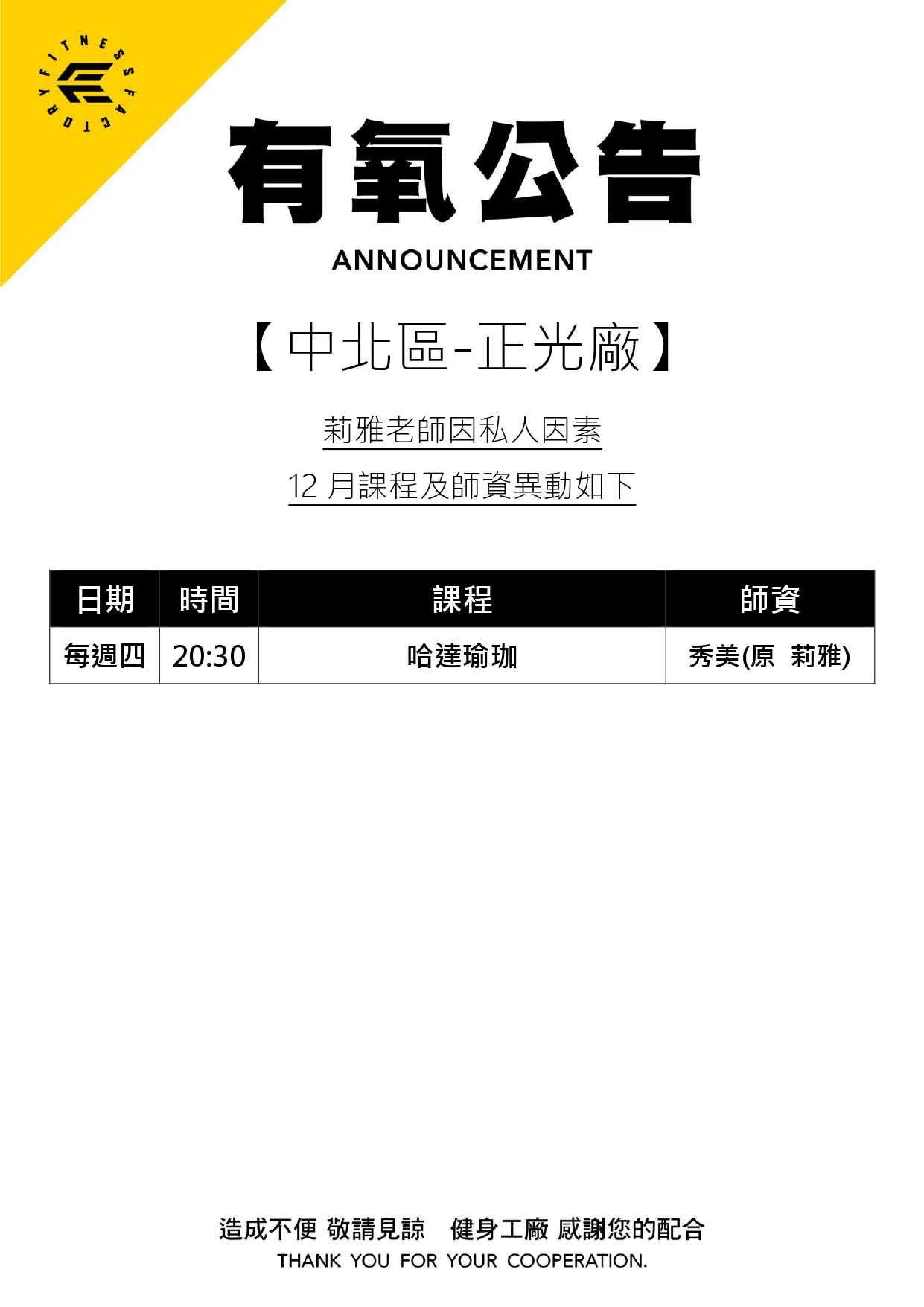 01Dec.2025【有氧公告】正光廠 12月課程異動公告