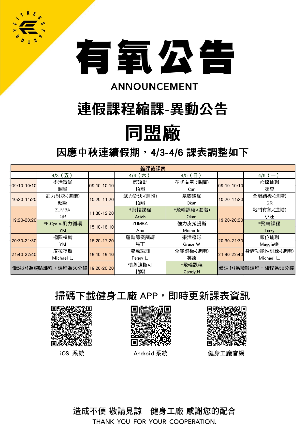 24Mar.2026【有氧公告】同盟廠清明連假縮課公告