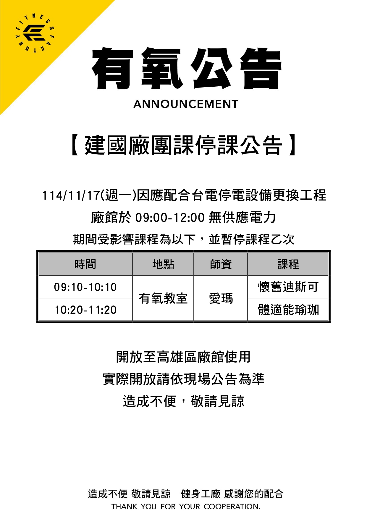 14Nov.2025【有氧公告】建國廠 11/17台電工程停課公告
